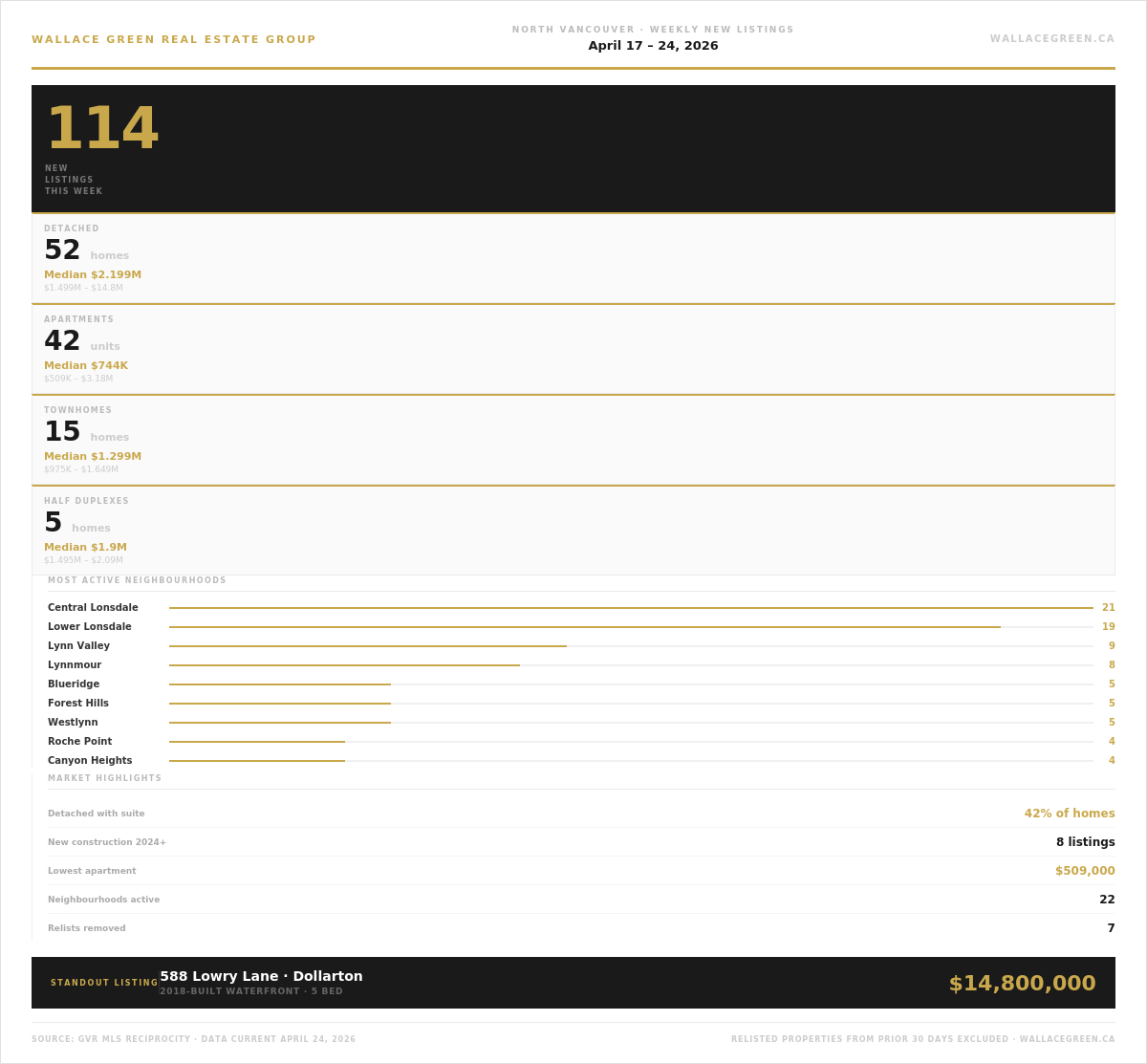 114 new properties came to market across North Vancouver this past week. Apartments led with 42 new listings ranging from $509,000 to $3,180,000 (median $744,000), followed by 52 detached homes from $1,499,000 to $14,800,000 (median $2,199,000), 15 townhomes from $974,900 to $1,649,000 (median $1,299,000), and 5 half duplexes from $1,495,000 to $2,089,900 (median $1,899,900).Central Lonsdale and Lower Lonsdale were the most active neighbourhoods with 21 and 19 new listings respectively. Lynn Valley (9), Lynnmour (8), Blueridge (5), Forest Hills (5), and Westlynn (5) also saw meaningful new supply. Half duplexes were concentrated entirely in Central Lonsdale this week, including three brand new 2026-built units on W 14th Street. Harbourside continued adding new construction inventory with two more units at 755 Harbourside Drive. Of the 52 detached homes, 22 include a secondary suite — nearly one in two. Every listing below links directly to the full details page on wallacegreen.ca.This Week at a Glance