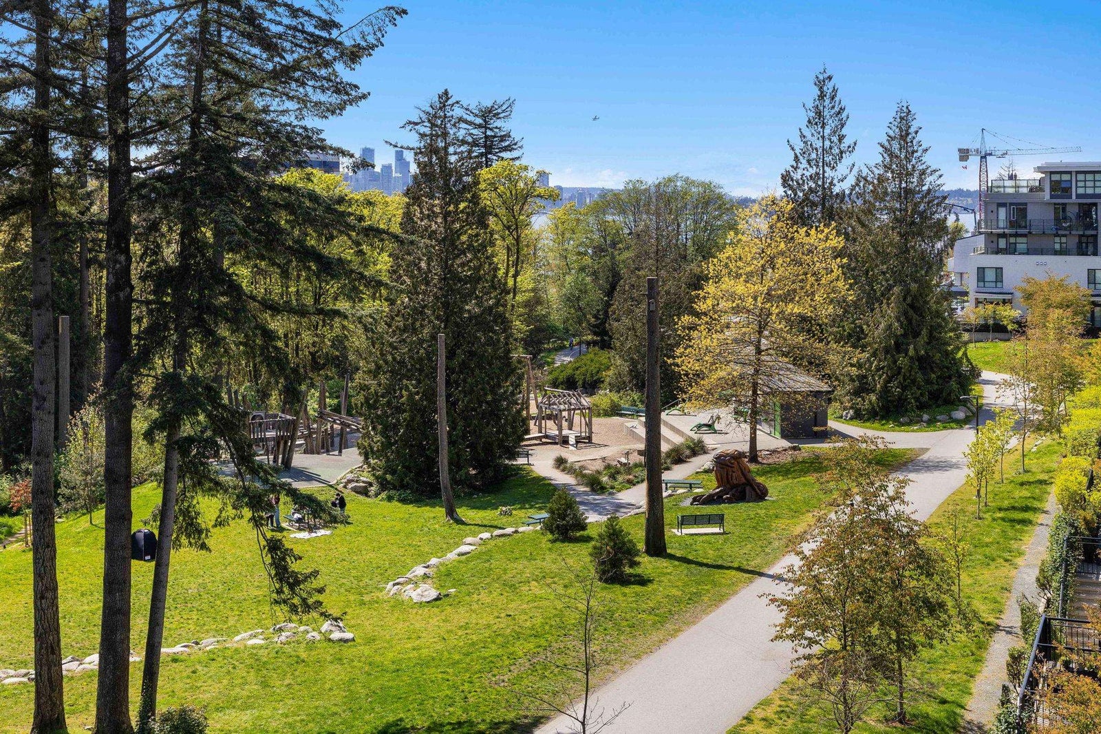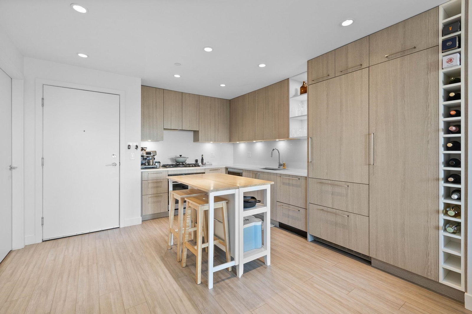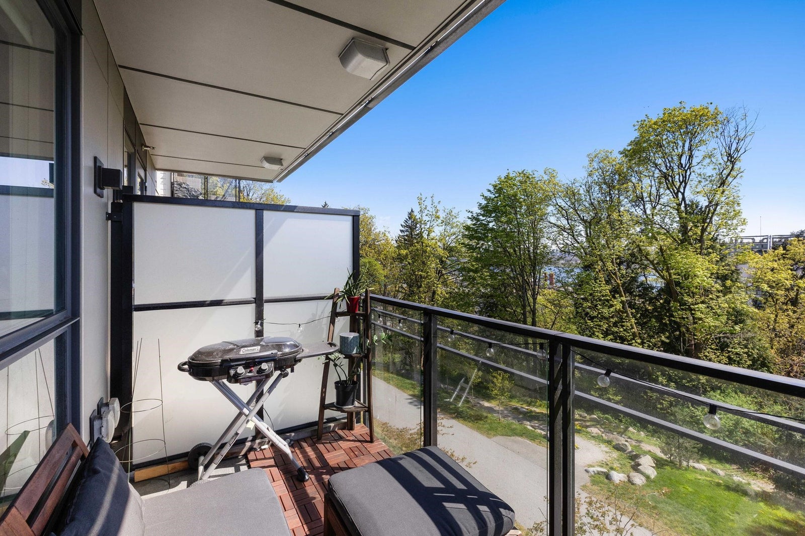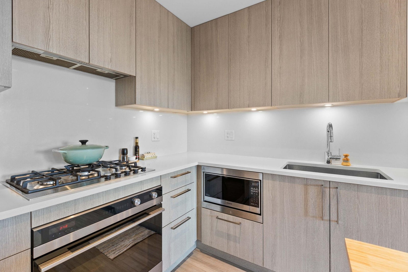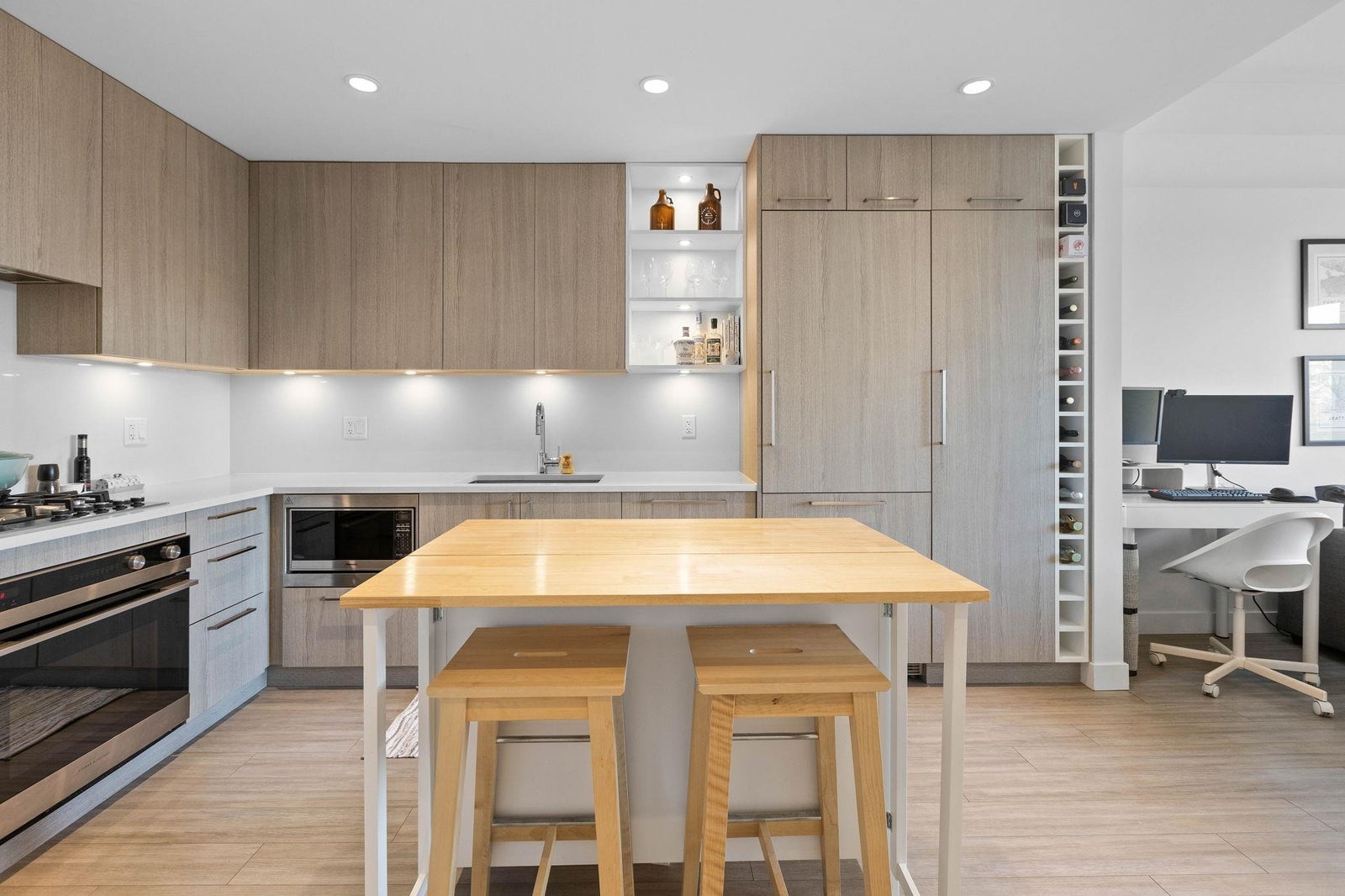 PARKSIDE FACING. Rare, south facing one bedroom + flex home at the popular Green on Queensbury building in Moodyville! Among the best one bedroom plans in the strata. This beautiful unit boasts 9’ ceilings, creating a bright, airy atmosphere overlooking Moodyville Park. High-end features include an open concept kitchen with Fisher & Paykel appliances, gas cooktop, and quartz counters. Enjoy a spa-inspired bathroom and year-round comfort with room-controlled heating & cooling. The LEED Platinum certified building offers amenities such as a fitness centre, guest suite, lounge, and EV charging. Pet friendly, with 1 parking spot included.
