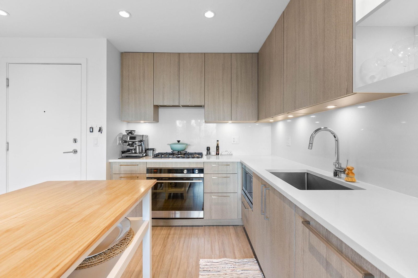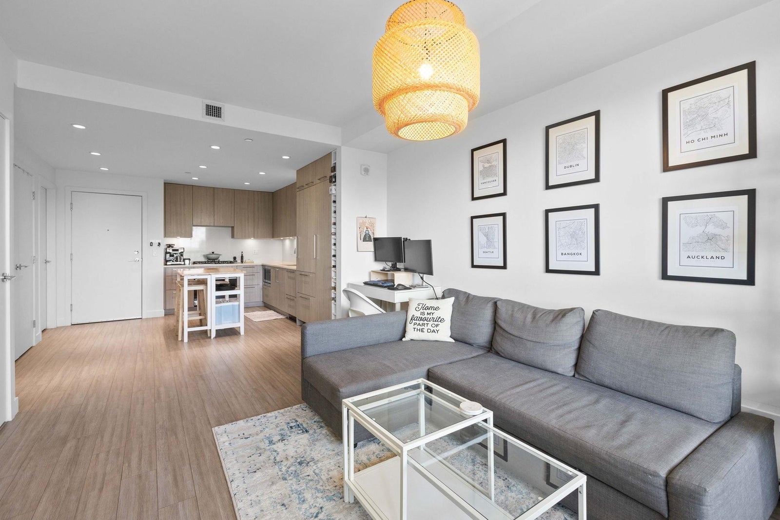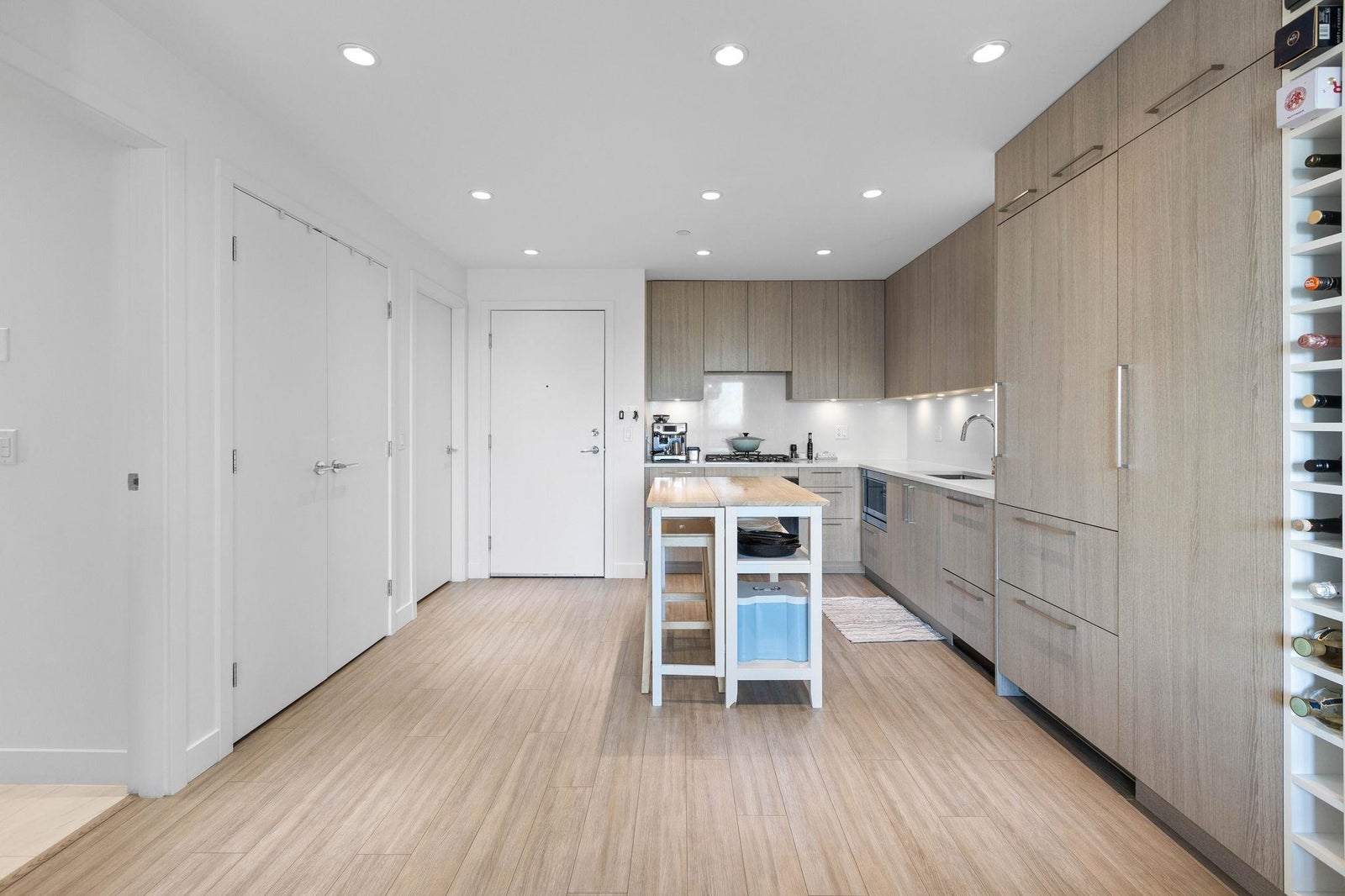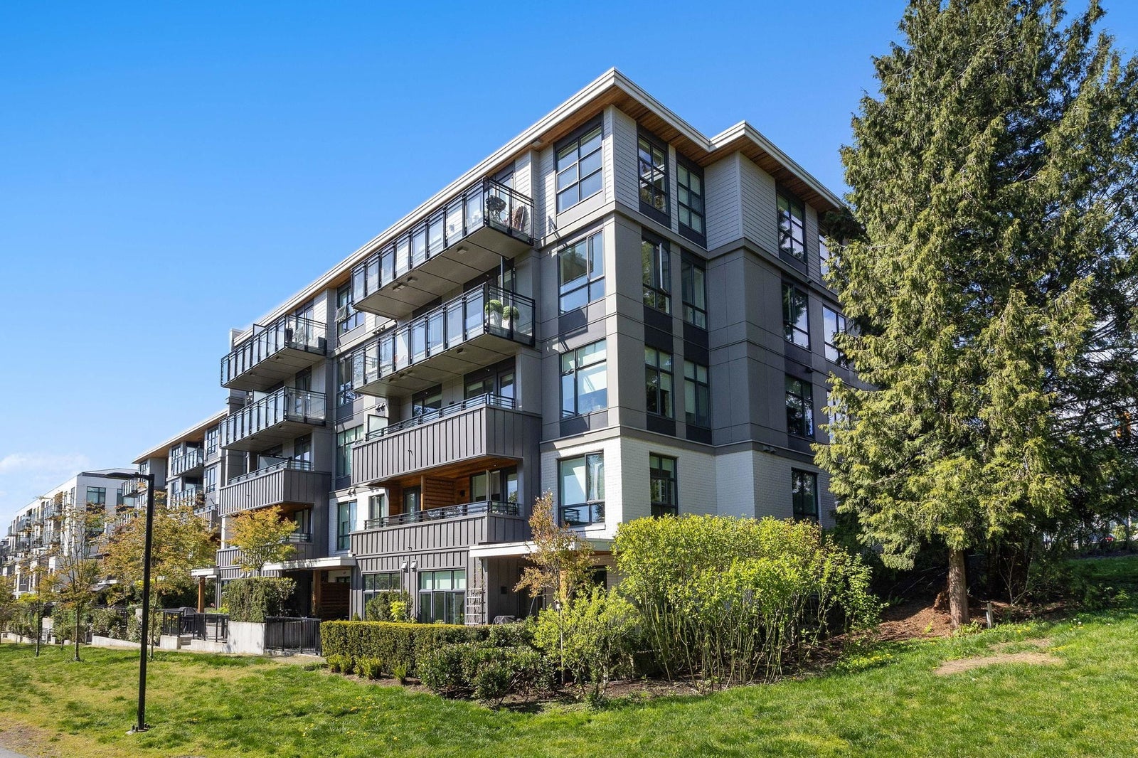 PARKSIDE FACING. Rare, south facing one bedroom + flex home at the popular Green on Queensbury building in Moodyville! Among the best one bedroom plans in the strata. This beautiful unit boasts 9’ ceilings, creating a bright, airy atmosphere overlooking Moodyville Park. High-end features include an open concept kitchen with Fisher & Paykel appliances, gas cooktop, and quartz counters. Enjoy a spa-inspired bathroom and year-round comfort with room-controlled heating & cooling. The LEED Platinum certified building offers amenities such as a fitness centre, guest suite, lounge, and EV charging. Pet friendly, with 1 parking spot included.