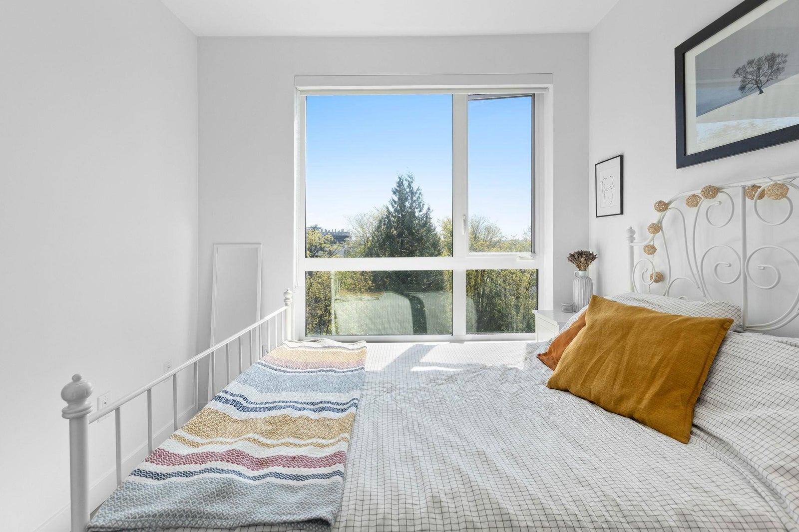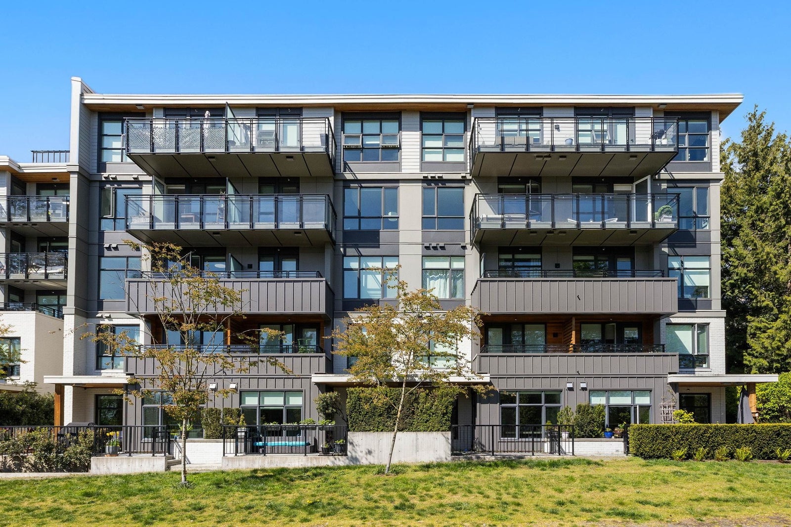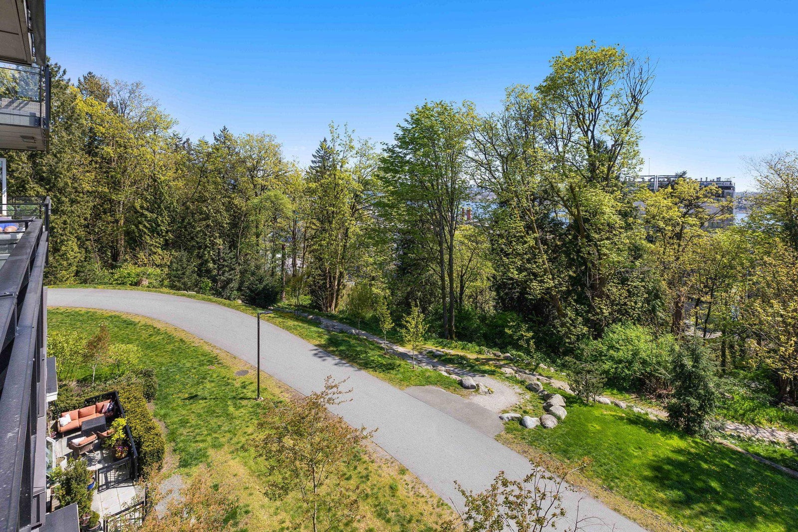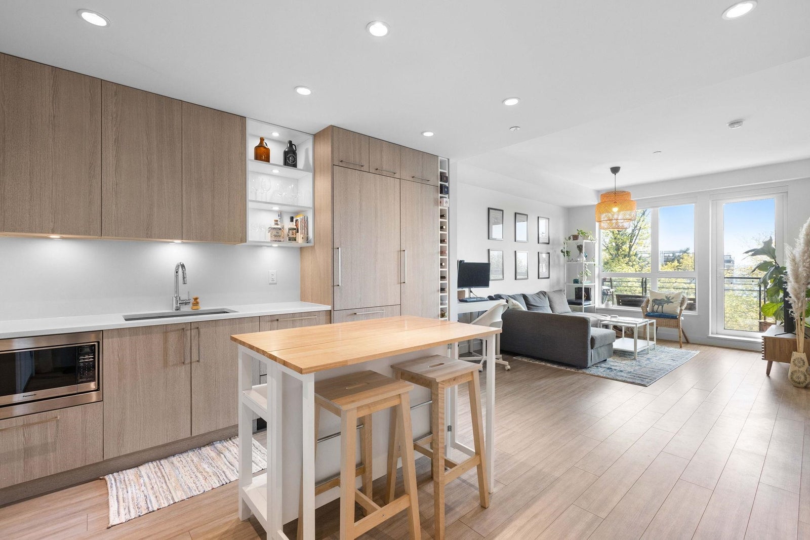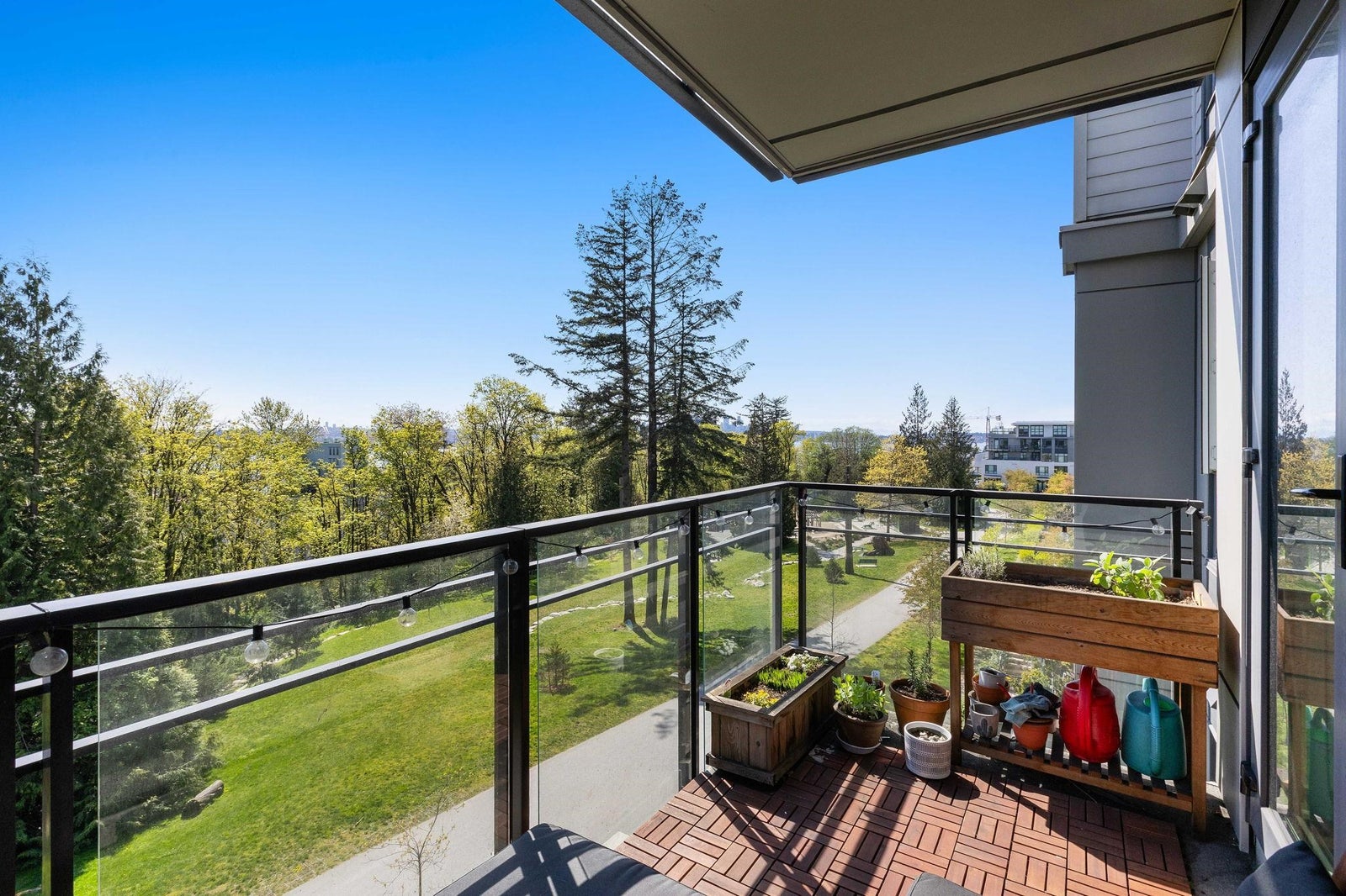 PARKSIDE FACING. Rare, south facing one bedroom + flex home at the popular Green on Queensbury building in Moodyville! Among the best one bedroom plans in the strata. This beautiful unit boasts 9’ ceilings, creating a bright, airy atmosphere overlooking Moodyville Park. High-end features include an open concept kitchen with Fisher & Paykel appliances, gas cooktop, and quartz counters. Enjoy a spa-inspired bathroom and year-round comfort with room-controlled heating & cooling. The LEED Platinum certified building offers amenities such as a fitness centre, guest suite, lounge, and EV charging. Pet friendly, with 1 parking spot included.