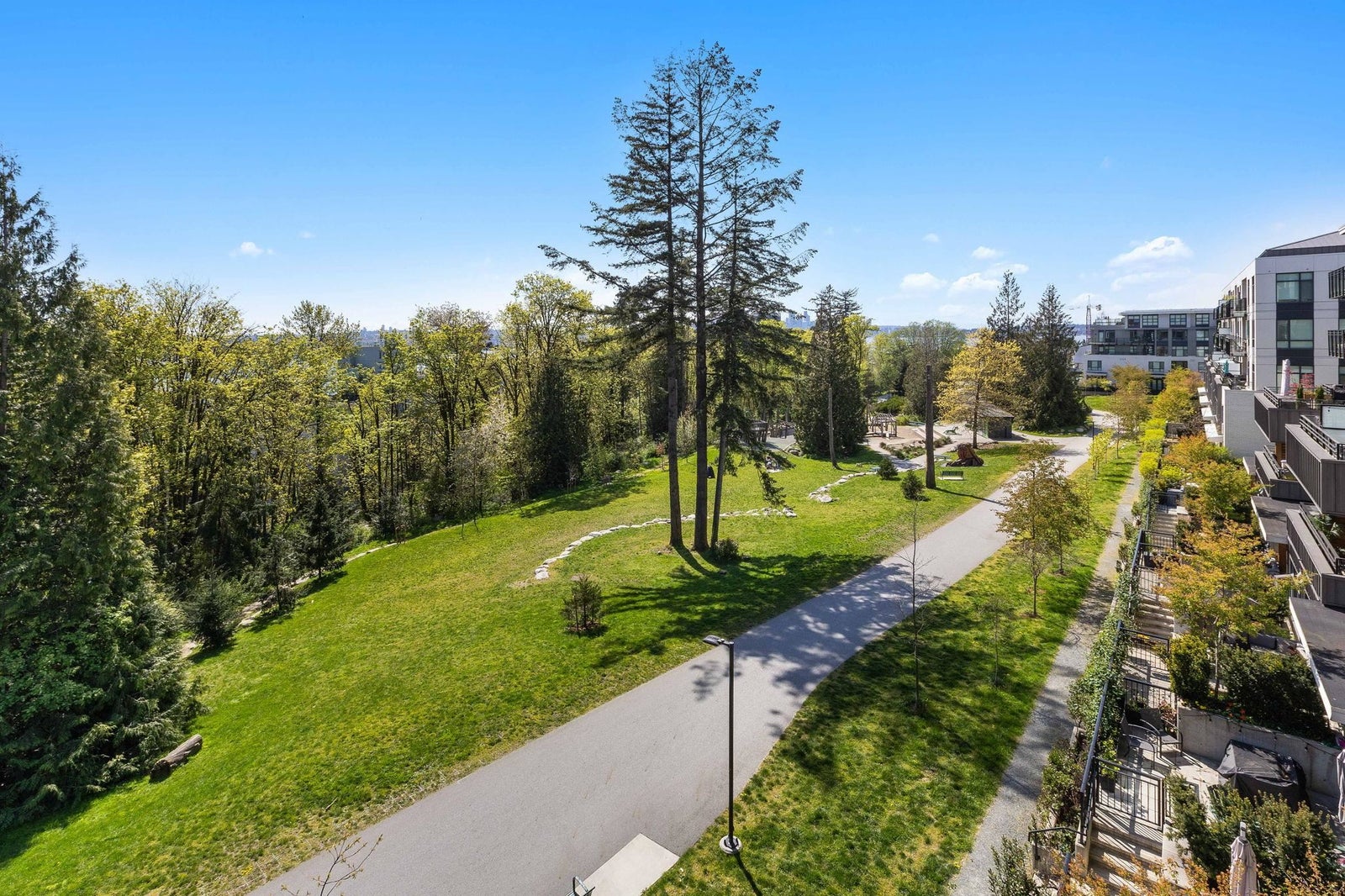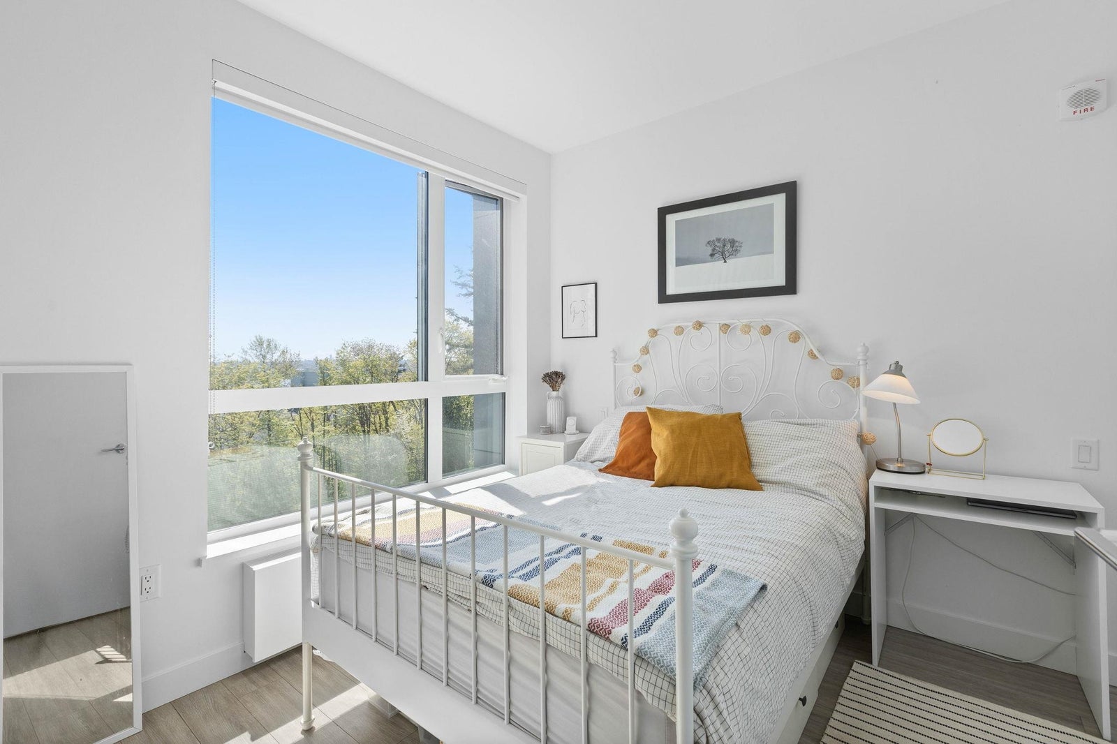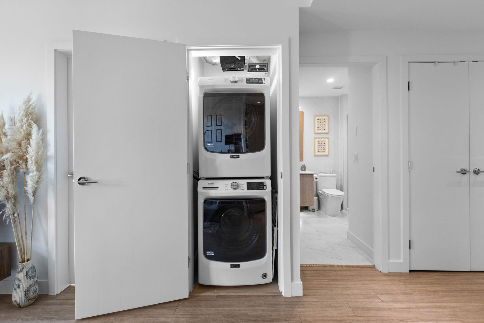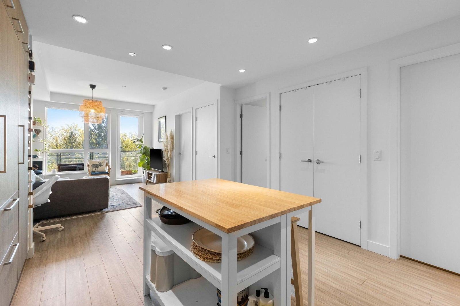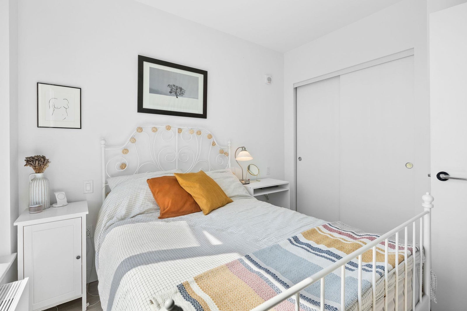PARKSIDE FACING. Rare, south facing one bedroom + flex home at the popular Green on Queensbury building in Moodyville! Among the best one bedroom plans in the strata. This beautiful unit boasts 9’ ceilings, creating a bright, airy atmosphere overlooking Moodyville Park. High-end features include an open concept kitchen with Fisher & Paykel appliances, gas cooktop, and quartz counters. Enjoy a spa-inspired bathroom and year-round comfort with room-controlled heating & cooling. The LEED Platinum certified building offers amenities such as a fitness centre, guest suite, lounge, and EV charging. Pet friendly, with 1 parking spot included.